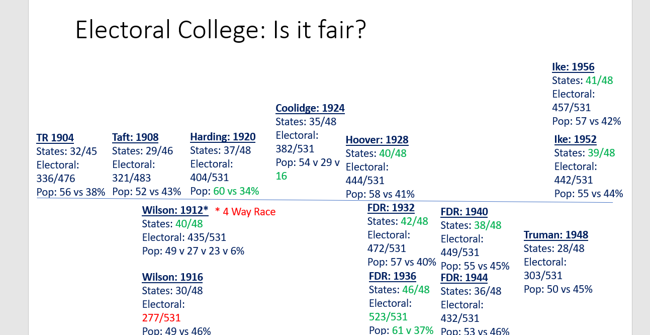 If Biden only had the popular vote to give him a mandate as the president 50.7% to 47.7%, he would be about average compared to modern presidents since JFK. But look at where his mandate gets really low and the electoral college gives him a boost. With only 25 states in support of Biden he is near the bottom of modern presidents (only JFK did worse and Obama won with only 26 once), worse than any republican has done with 50 states (Trump won 30 states). The electoral college actually strengthens Biden’s mandate. He has a slim, but now average population vote and an electoral count equal to Trump, JFK, Nixon, Truman, and Carter—but below almost every other president since 1904. His electoral college puts him above the mandate of Bush 43. It does not hurt him at all—it actually strengthens him.