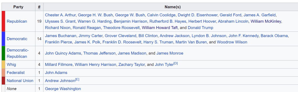 The next one shifts to the more modern era of presidents and show clearly how the current election method allows for swings back and forth between the parties, ensuring no party becomes the only view of how to run America. Given too long in power any party would tend to its most extreme views.